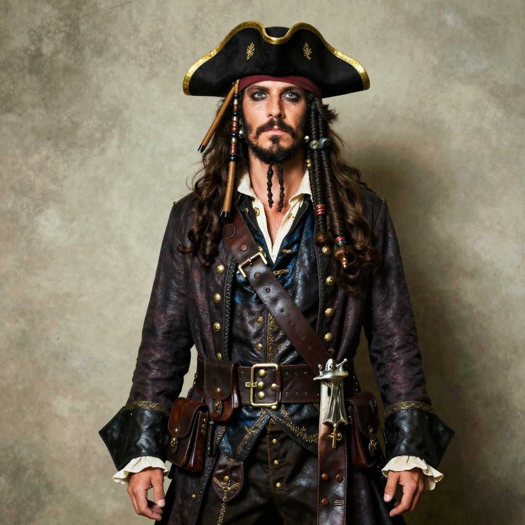 Photograph of a man dressed as a pirate. He has long, dark brown hair, a full beard, and wears a black tricorn hat with gold trim. His pirate outfit includes a black, buttoned, leather coat with gold accents, white shirt with ruffled cuffs, and brown leather belt with a large brass buckle. He also has various trinkets and a sword sheath at his waist. The background is a textured, gray wall. His expression is serious, and he stands facing forward with his arms slightly relaxed at his sides. The overall style is realistic and detailed.