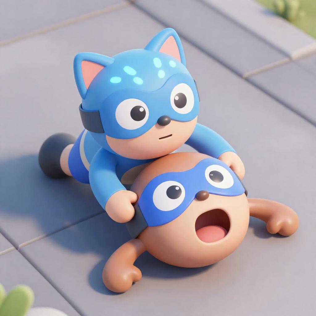 A colorful, digital CGI image shows two anthropomorphic characters in a dynamic pose on a tiled floor. One character, with a blue mask and glowing white patterns, is lying on top of a brown, masked character with a wide-open mouth. The blue character's mask has cat-like ears, and both characters have exaggerated, cartoonish features.