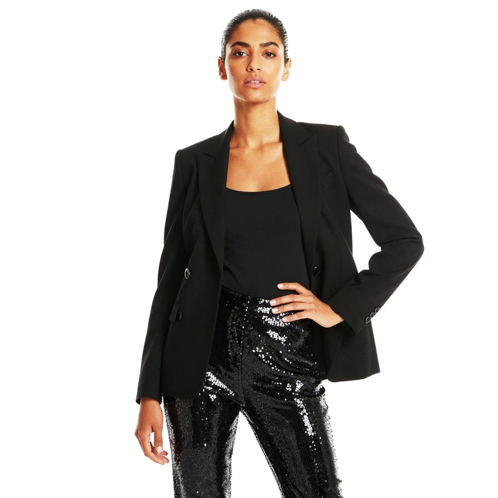 A high-contrast, black-and-white photograph of a black, sequined clutch bag with a thin black strap and bow detail. The bag is angled diagonally with the top right corner facing the viewer. The sequins create a sparkling texture against the white background, making the bag's intricate design stand out sharply. The overall style is minimalist and stylish.