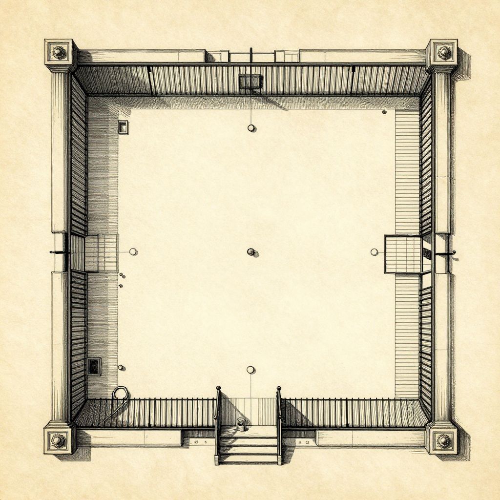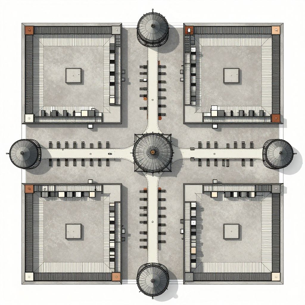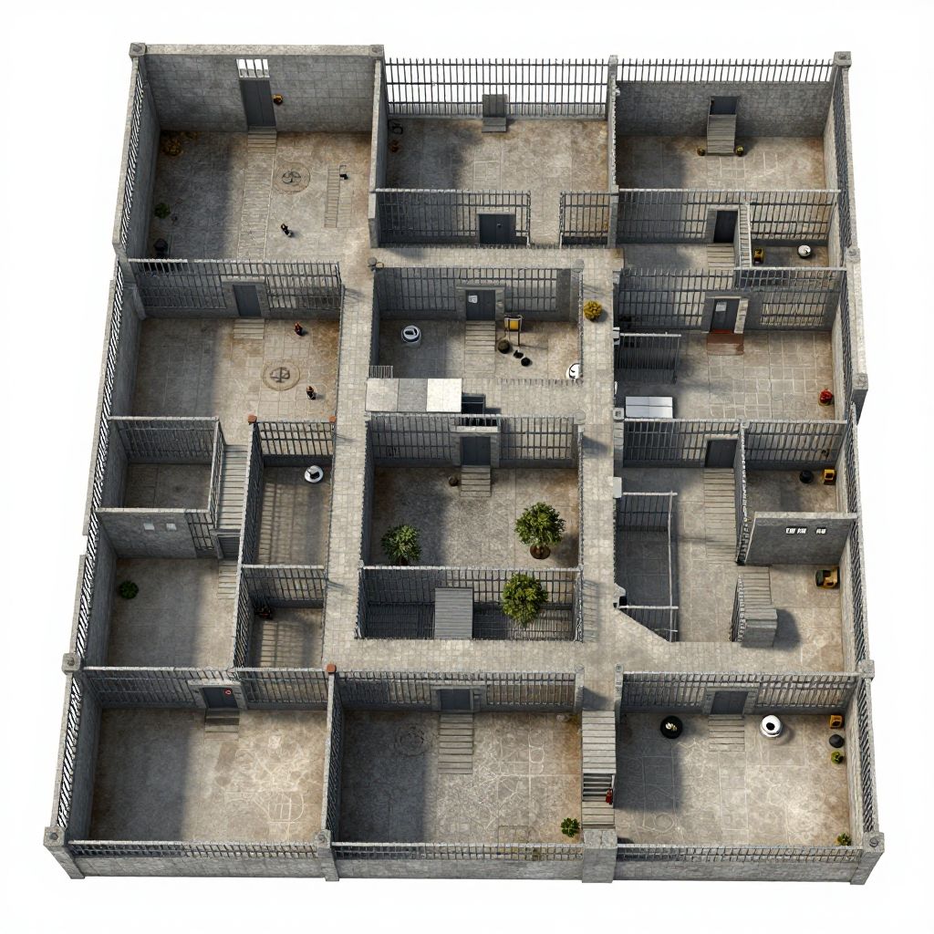Prison floor plans detailed blueprint style, top-down view, intricate cell layout, security zones, guard towers, corridors, muted grayscale with subtle color accents, architectural precision