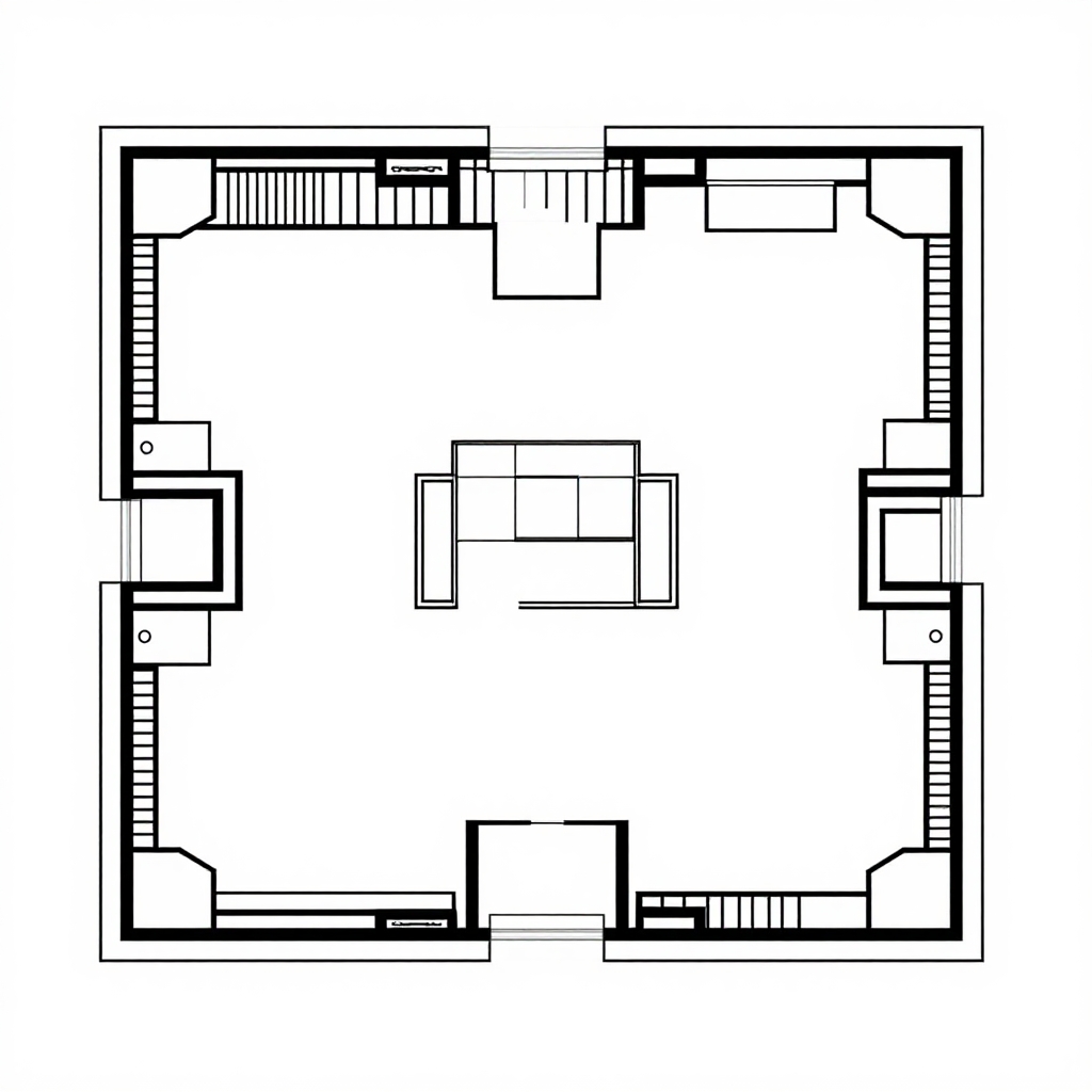 Top-down architectural drawing of a symmetrical, grid-like building with four square rooms, four circular towers, and a central rotunda.