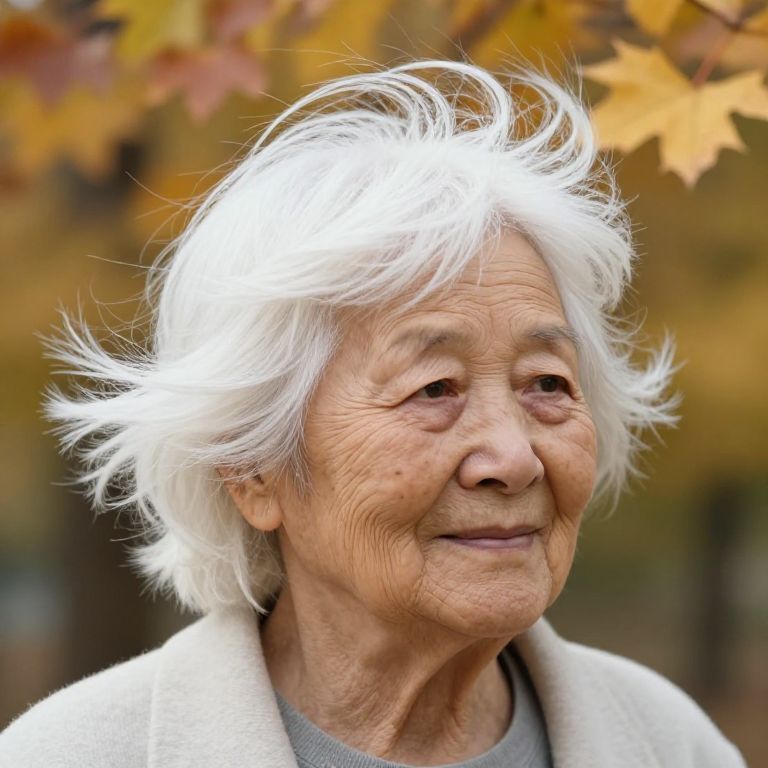 Photograph of an elderly Asian woman with gray hair, wearing a beige shirt and gray vest, sitting on a bench in a sunlit garden, surrounded