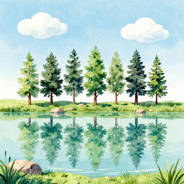 Peaceful lake scene showcases vibrant watercolor reflections of six tall evergreen trees mirrored perfectly in calm turquoise waters, framed by lush green grass and dotted with small rocks, under a serene sky with two fluffy white clouds.