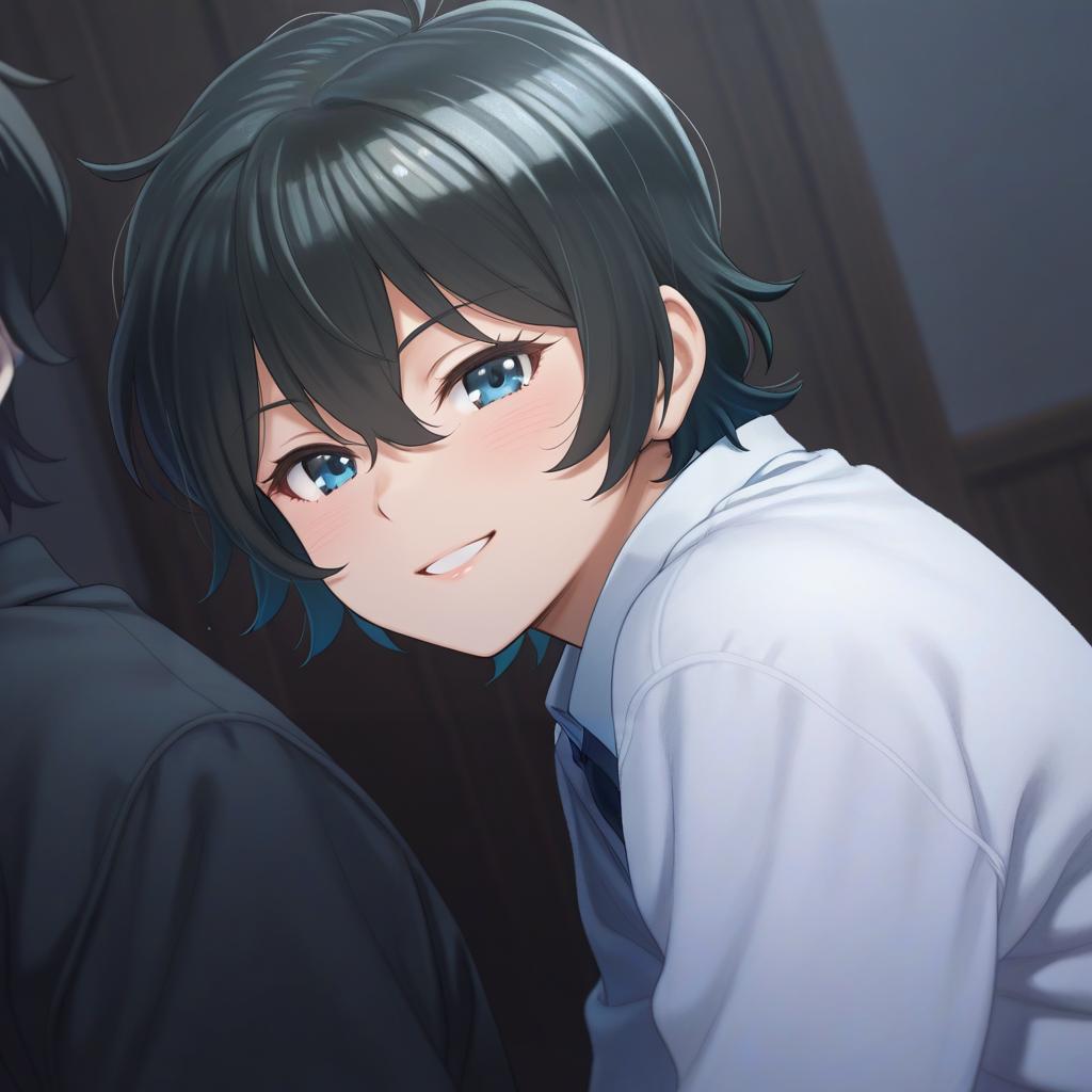 Close-up digital illustration of a young male character with short black hair and blue eyes, smiling gently. The character wears a white shirt and is rendered in a polished anime art style with soft lighting and detailed shading.