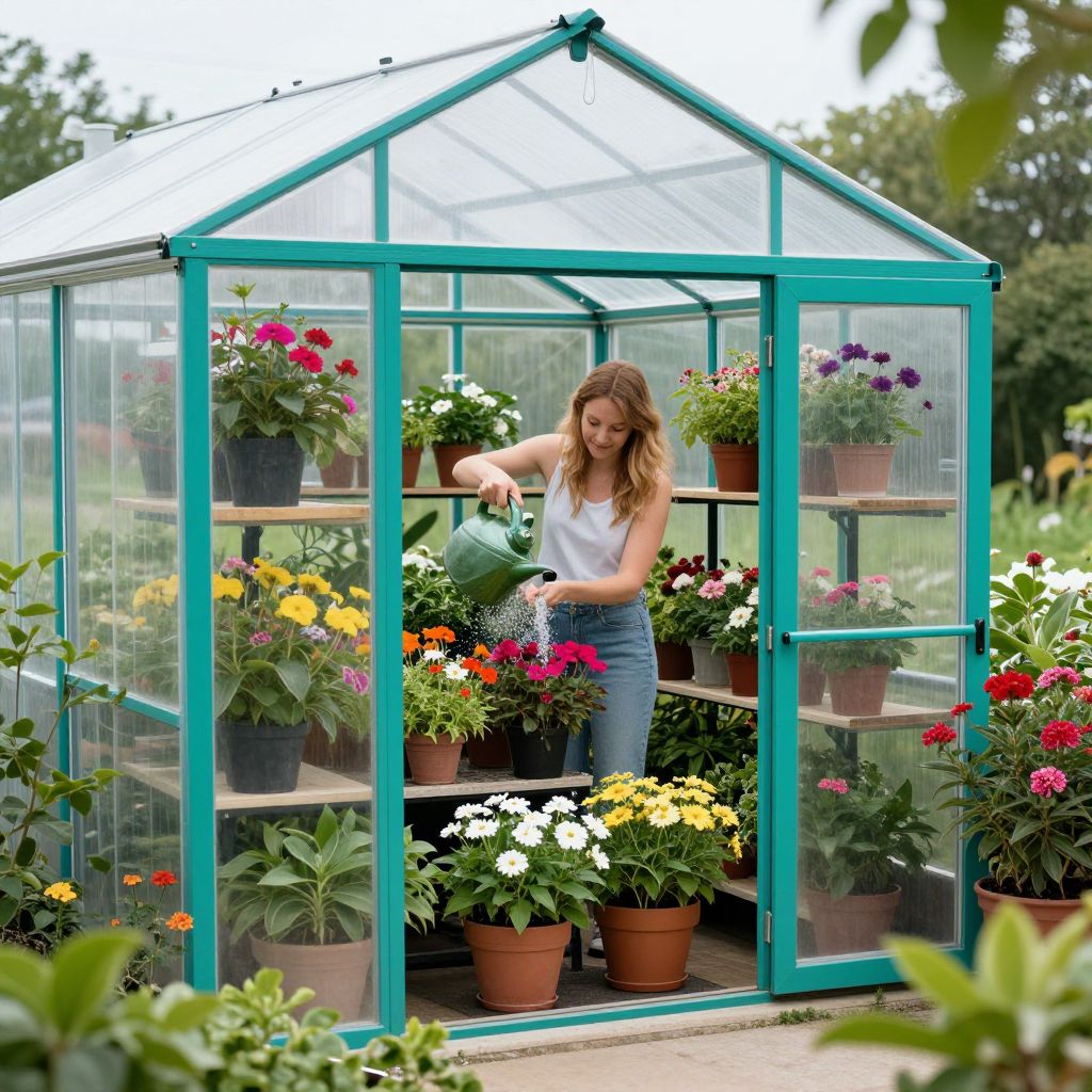Woman Watering Flowers in Greenhouse