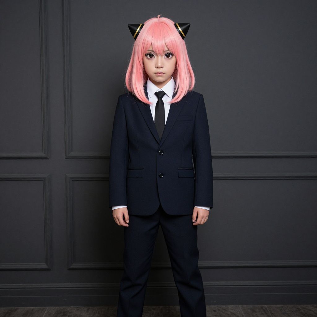 "Spy Family Costume, man in a suit and tie standing in a dark room"