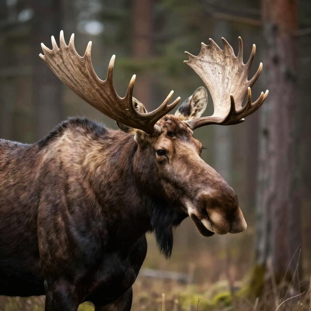 Highly detailed portrait of a gentle giant moose in muted forest brown tone, inspired by Winslow Homer, John James Audubon, Anselm Kiefer.