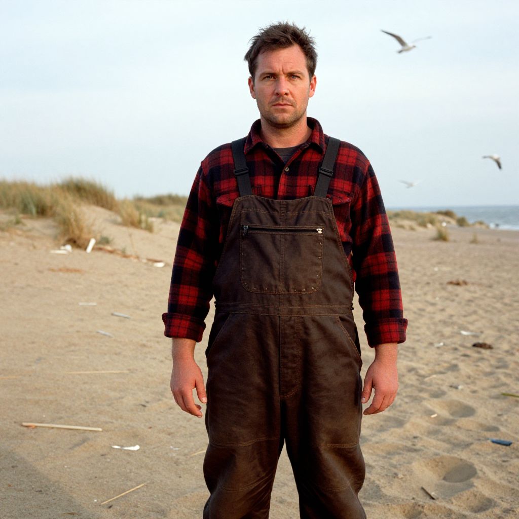 A man, flame-resistant bib overalls, dark brown, heavy canvas, padded knees, adjustable straps, worn over a long-sleeve plaid flannel shirt, red and black, coastal area, sand dunes covered in debris, seagulls circling overhead, eastman film stock, focused expression. Man has masculine face and piercing eyes