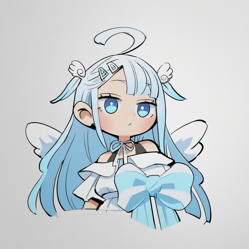 Amatsuka uto, indie virtual youtuber, 1girl, angel wings, blue eyes, blue hair, long hair, ahoge, two side up, hairclip, off-shoulder dress, bare shoulders, ribbon, virtual youtuber, virtual youtuber, by artist hounori, leet