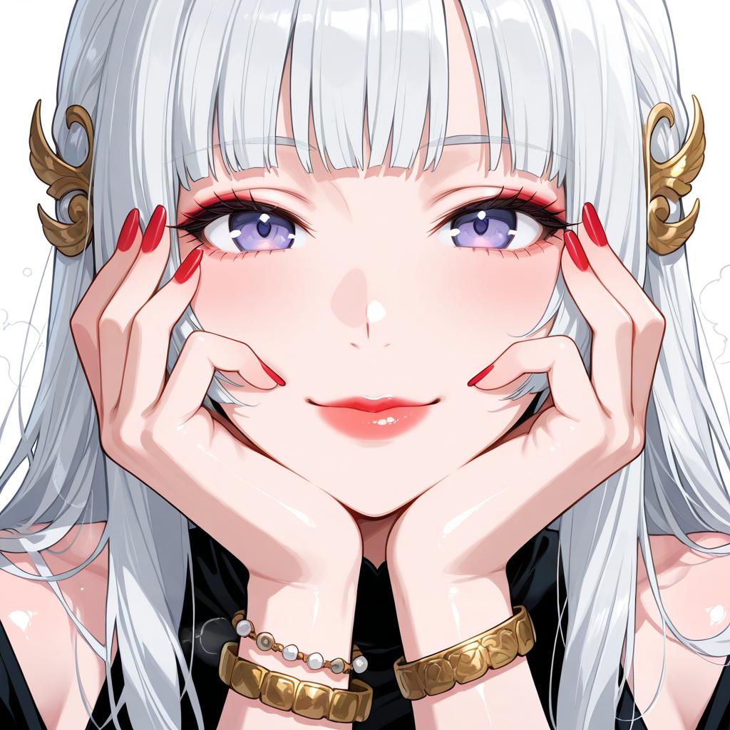 1girl, solo, long hair, looking at viewer, smile, blue eyes, hair ornament, white background, jewelry, white hair, closed mouth, blunt bangs, nail polish, bracelet, lips, grey eyes, portrait, red nails, close-up, red lips, hands on own face, hands on own cheeks, (mature female), (shiny skin), ((steaming body))