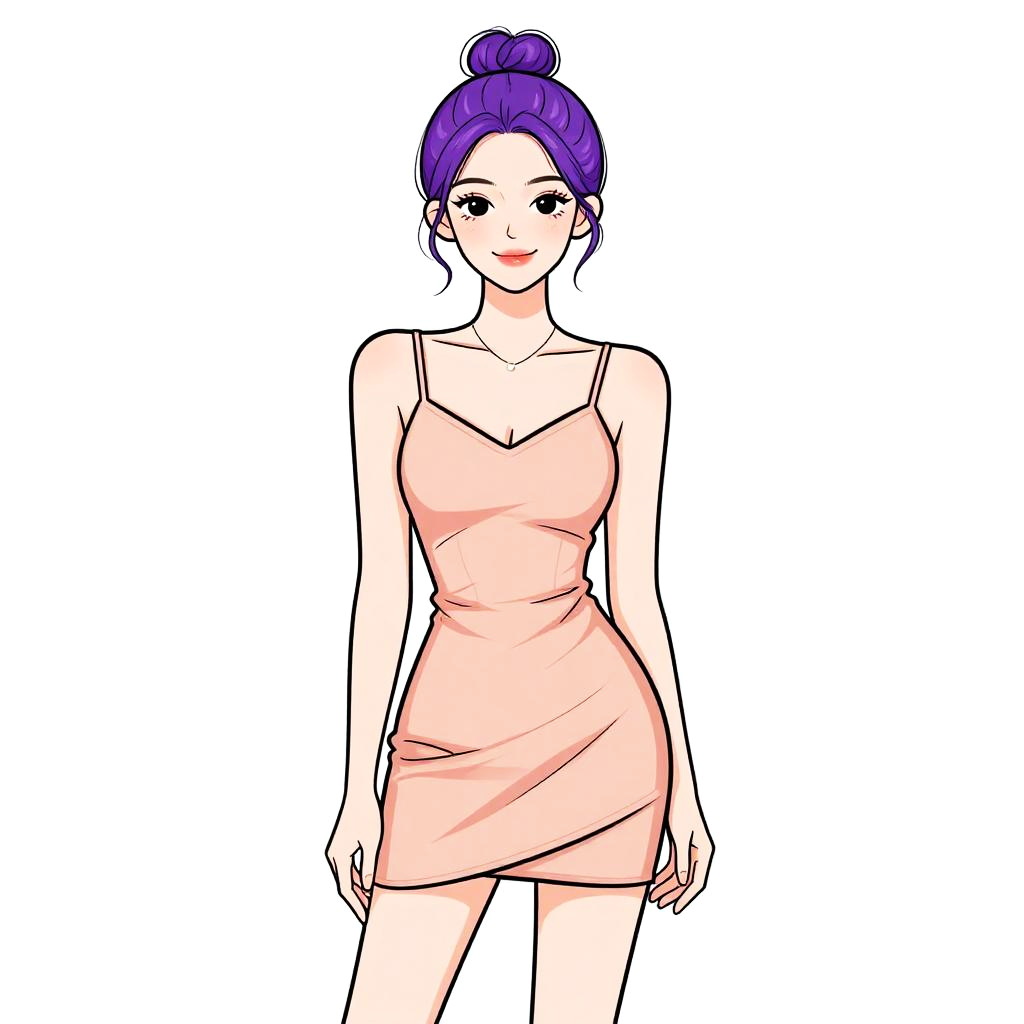 Digital anime-style drawing of a purple-haired woman in a white, long-sleeve, knee-length dress and black shoes, standing against a plain white