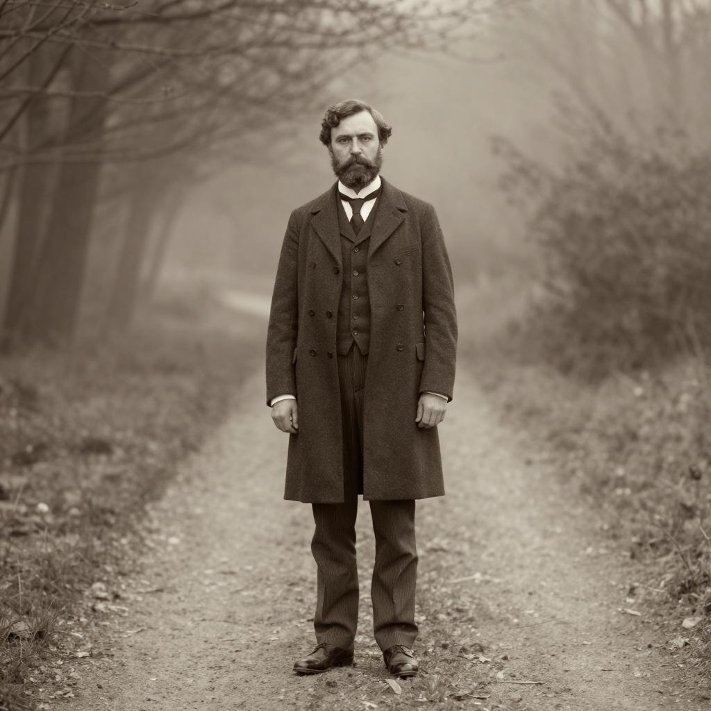 Sepia tone vintage style portrait of a man with a full beard wearing a classic early 20th century three-piece suit and double-breasted overcoat. The man stands on a foggy forest path surrounded by barren trees and natural foliage, with muted contrast and natural lighting emphasizing the historic fashion and atmospheric setting.