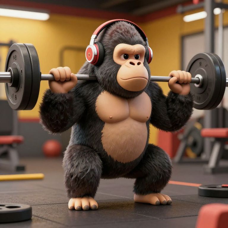 Retro-Inspired 3d gorilla, working out in gym, squating, head phones, vintage colorful, 8k design, 1000lbs weight lifting,