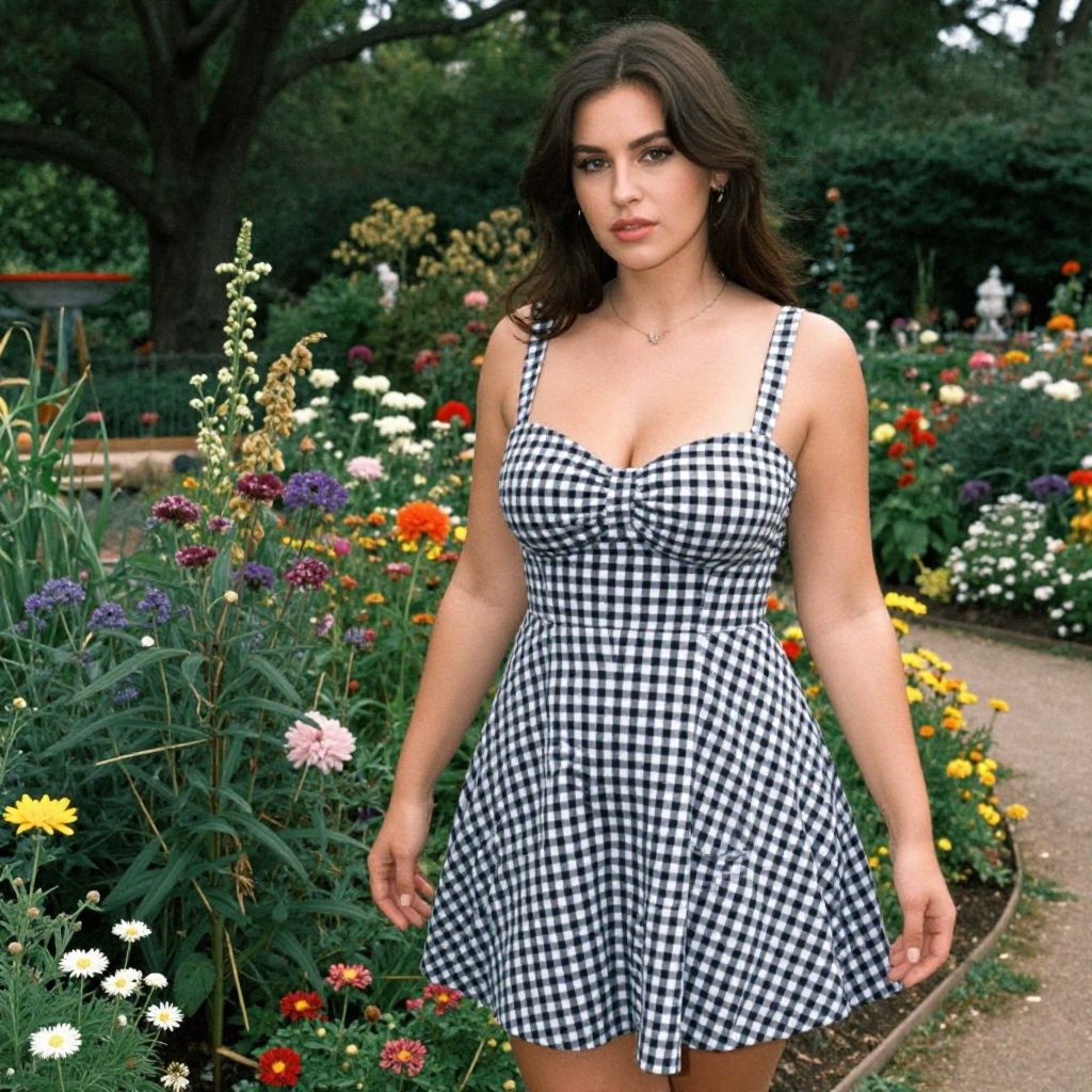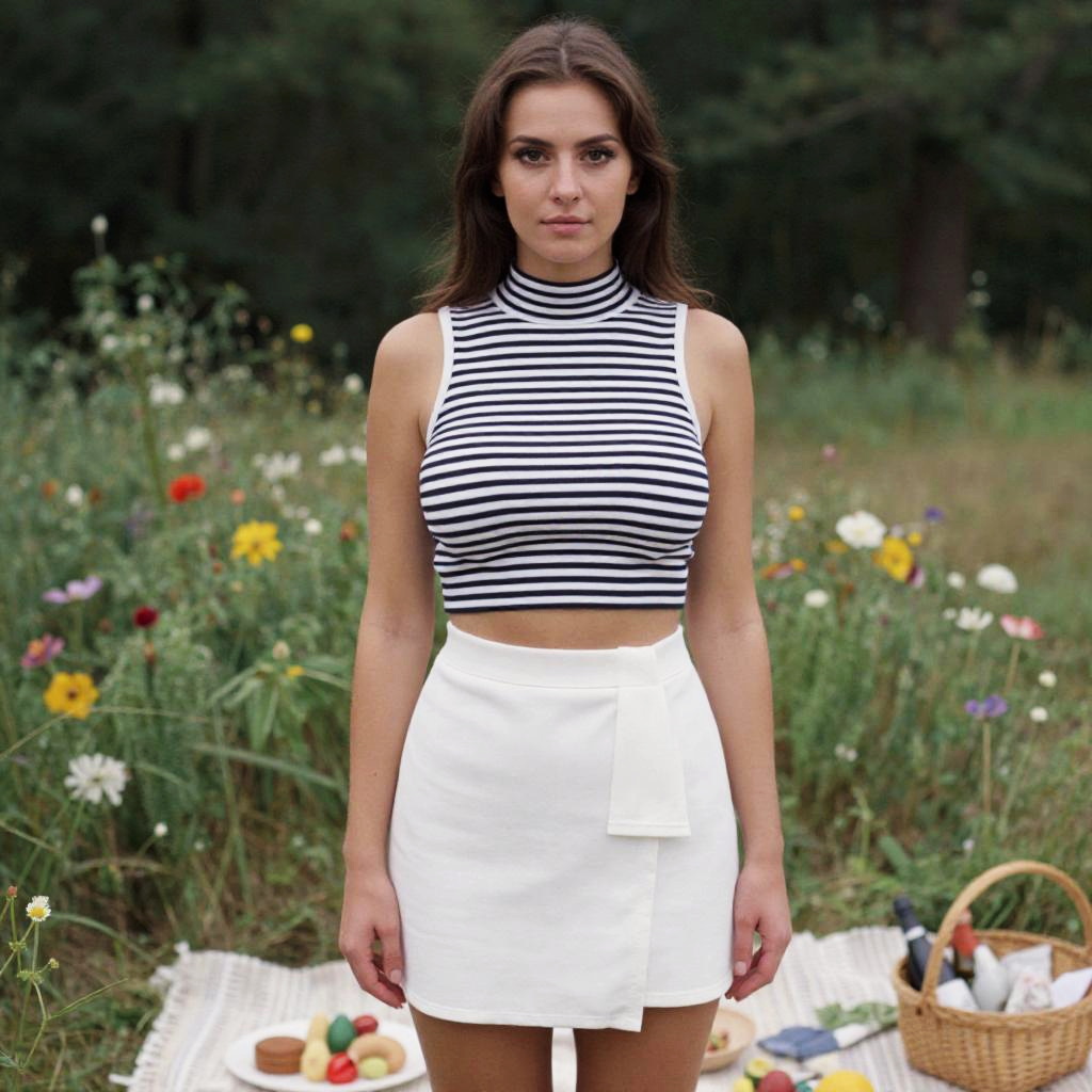 A Hourglass woman in a casual, short-sleeved skater dress in heathered grey with a rainbow graphic, enjoying a picnic setup in a floral meadow, captured in a vibrant Chromogenic film style. She is laughing and sharing snacks with friends, surrounded by colorful blankets and blooming flowers. Sexy. Pretty face and beаutiful eyes. Big breasts