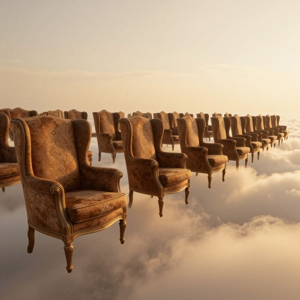 A photograph depicts an endless row of ornate, brown, Victorian-style armchairs floating in the sky, set against a backdrop of softly glowing, golden sunlight and fluffy clouds. The chairs, each with high, upholstered backs and carved wooden legs, are arranged in perfect alignment, creating a sense of depth and perspective. The rich, textured fabric of the chairs contrasts with the smooth, reflective surface of the clouds below, enhancing the surreal, dreamlike quality of the scene. The overall composition evokes a sense of tranquility and timeless elegance.