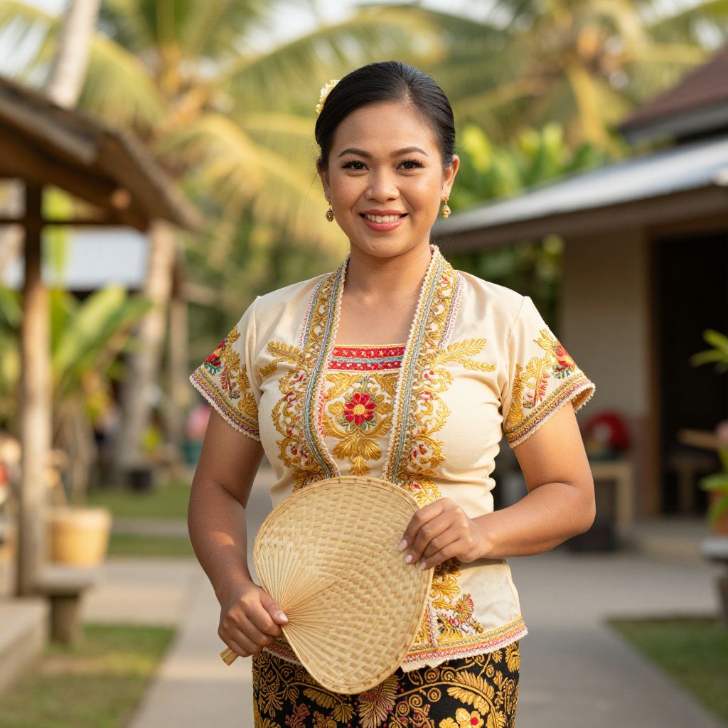 Smiling Asian woman in traditional cream and gold embroidered blouse, holding woven fan, standing in sunny tropical garden. Photo.