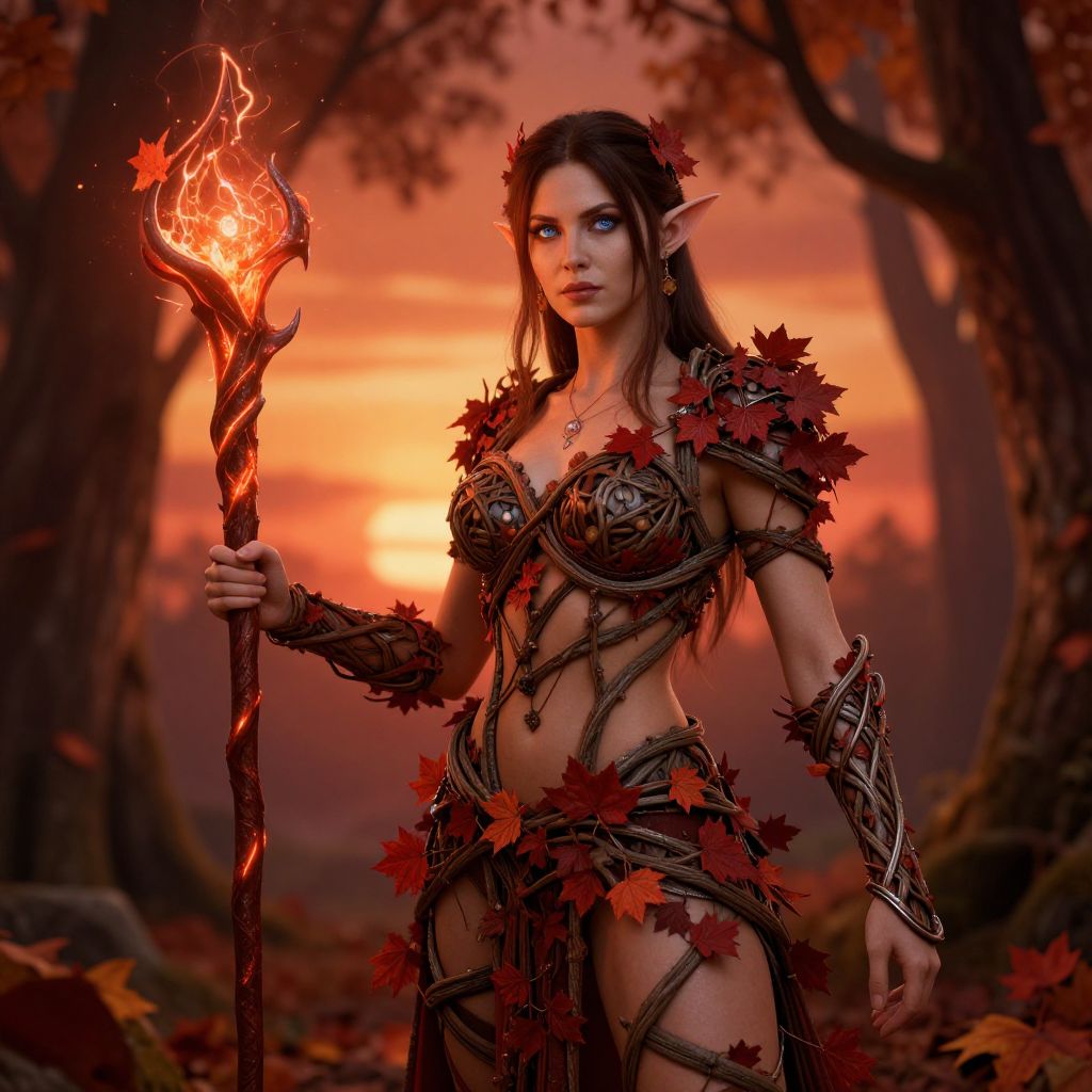 Female autumn eladrin warrior, adorned in elegant armor made of intertwining branches and crimson leaves, wielding a staff crackling with autumn magic, her eyes reflecting the twilight colors of fall, set against a backdrop of a magical forest under a fiery sunset