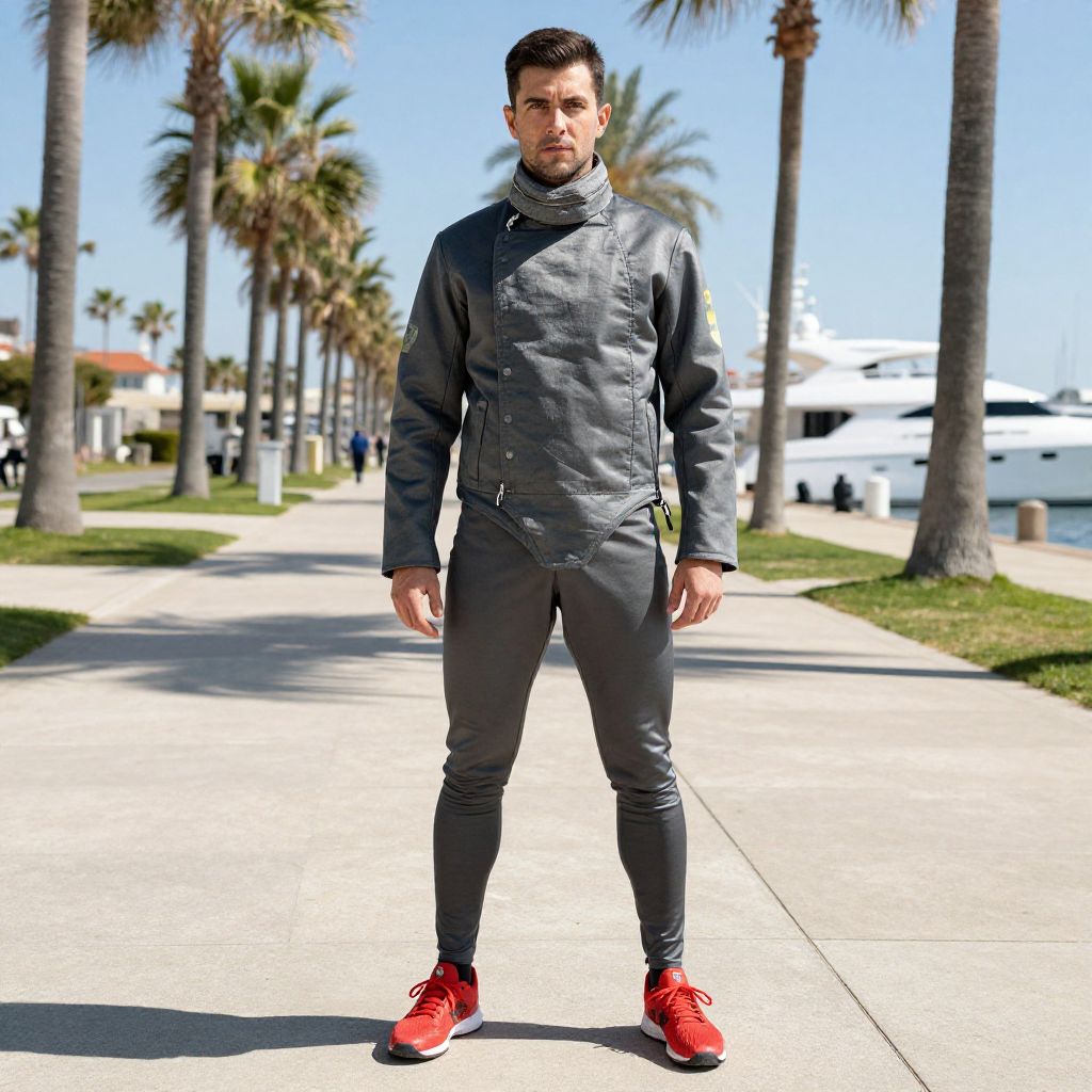A man, charcoal gray fencing jacket, reflective accents, quick-dry leggings, vibrant red training shoes, sunlit promenade, palm trees swaying, luxury yachts docked, hand-tinted photograph, confident expression Man has masculine face and piercing eyes
