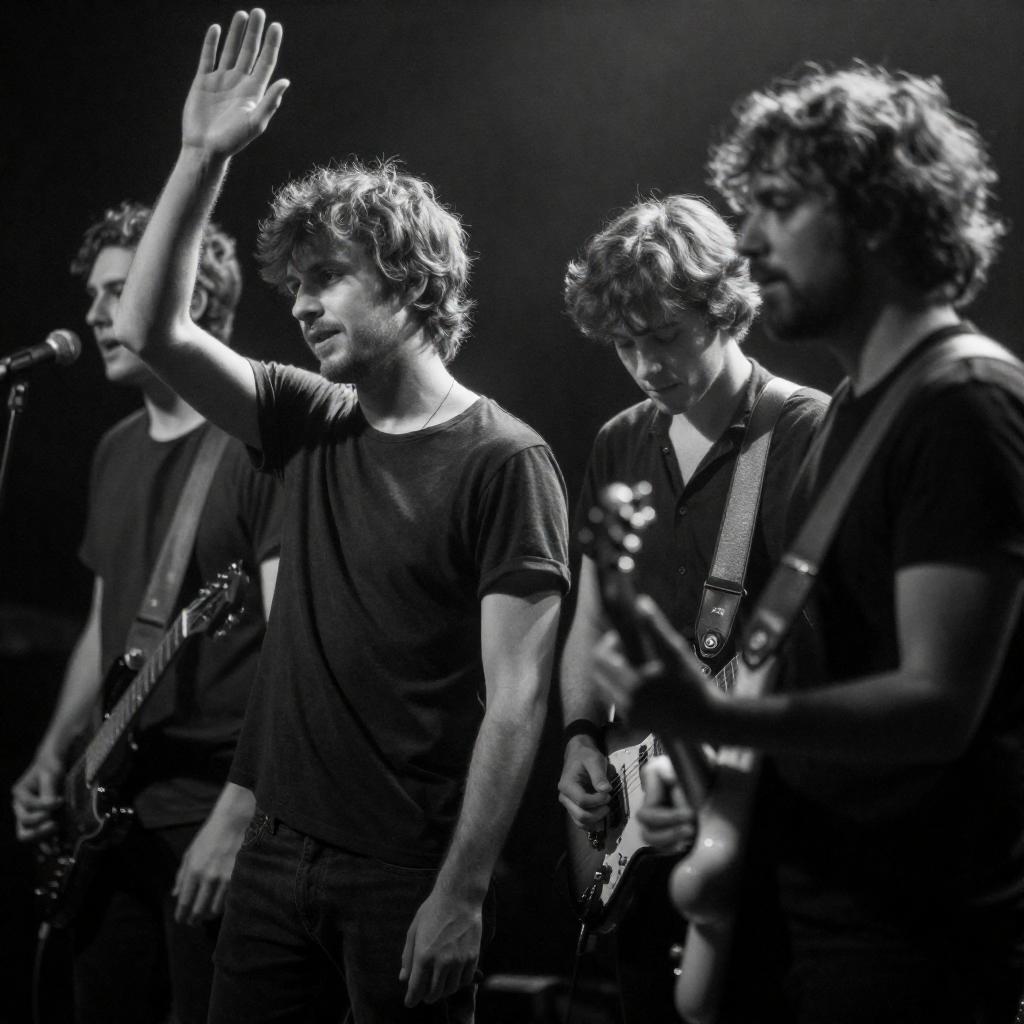 Black-and-white photograph of a live music performance. Four men with varied hairstyles and casual clothing stand closely together, partially illuminated by stage lights. One man in the foreground raises his hand, while another in the background plays an electric guitar. The guitarist's face is obscured by the instrument. The background is dark, emphasizing the performers.