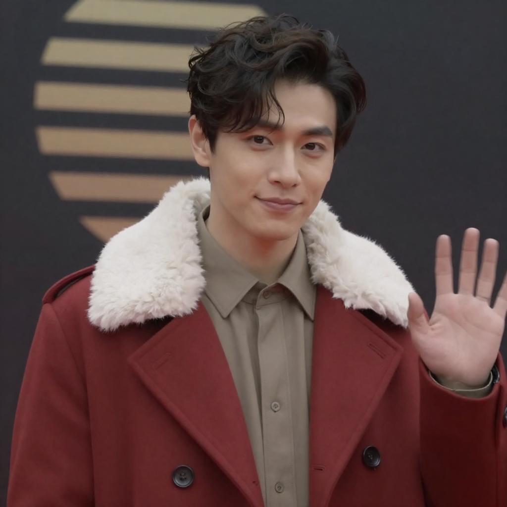 Man with dark, wavy hair wearing a red coat with a white fur collar, light brown shirt. Mid-shot, facing camera, smiling slightly, right hand raised. Background: dark, blurred, with a large, out-of-focus striped object.