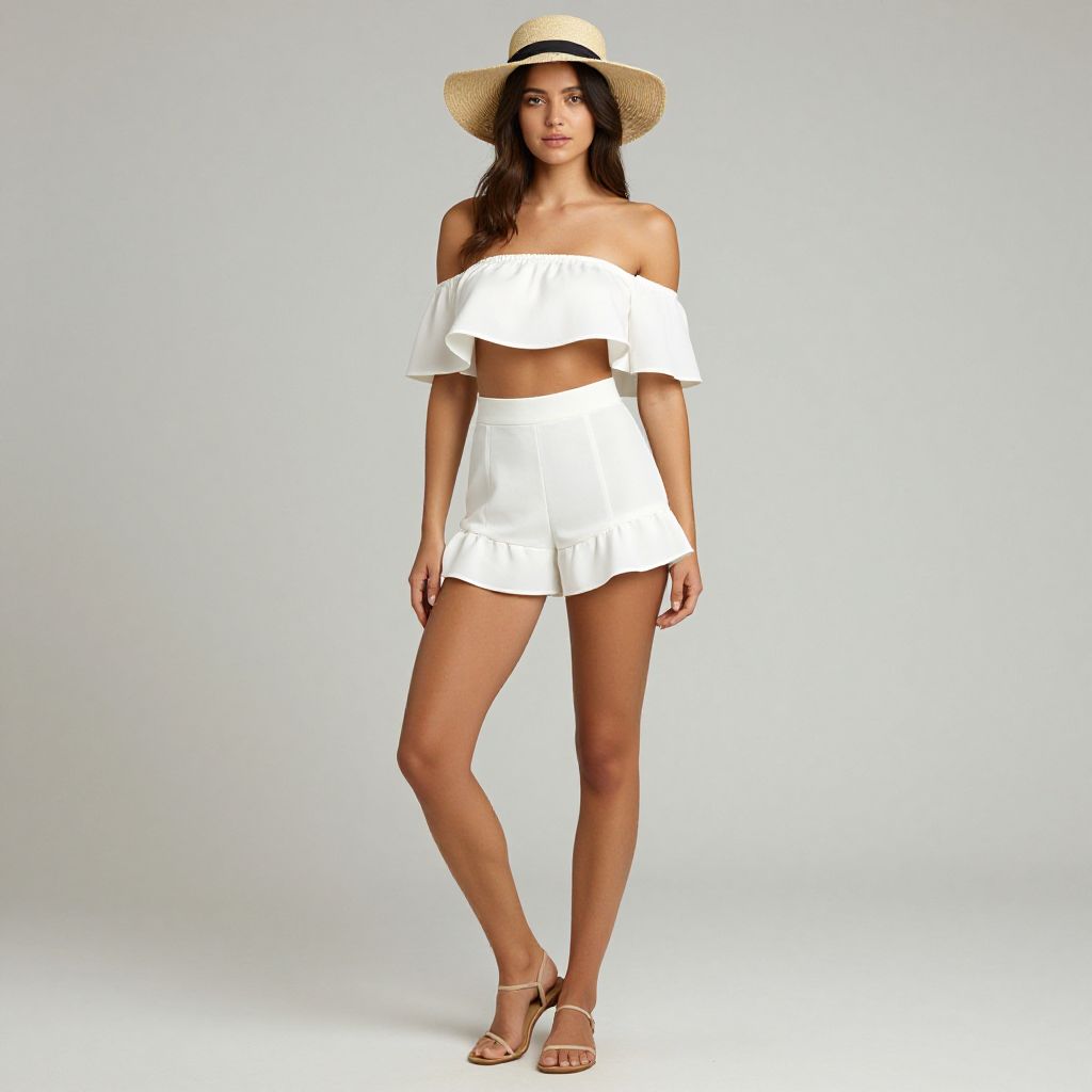 Photograph of a young woman with light brown skin and long, dark brown hair, wearing a beige straw hat with a black ribbon. She is dressed in an off-the-shoulder, white, ruffled crop top and matching high-waisted, white, ruffled shorts. She stands against a plain, light gray background, with her right leg slightly forward and left arm relaxed by her side. She is wearing white, open-toed, high-heeled sandals. Her expression is neutral, and she gazes directly at the camera. The overall style is casual and summery.