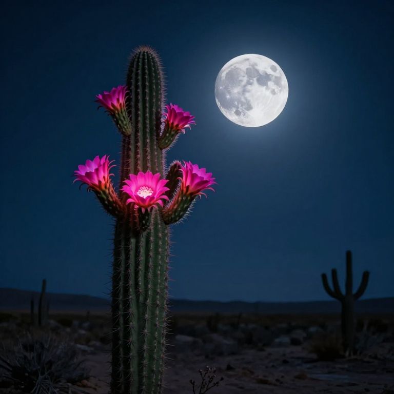 A towering cactus stands defiantly against the night sky, adorned with vibrant pink blooms that seem to pulse with otherworldly light, while a luminous, cratered moon looms behind, casting an ethereal glow over the desolate desert landscape.