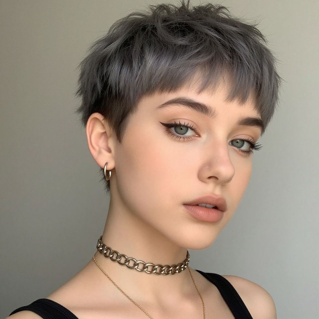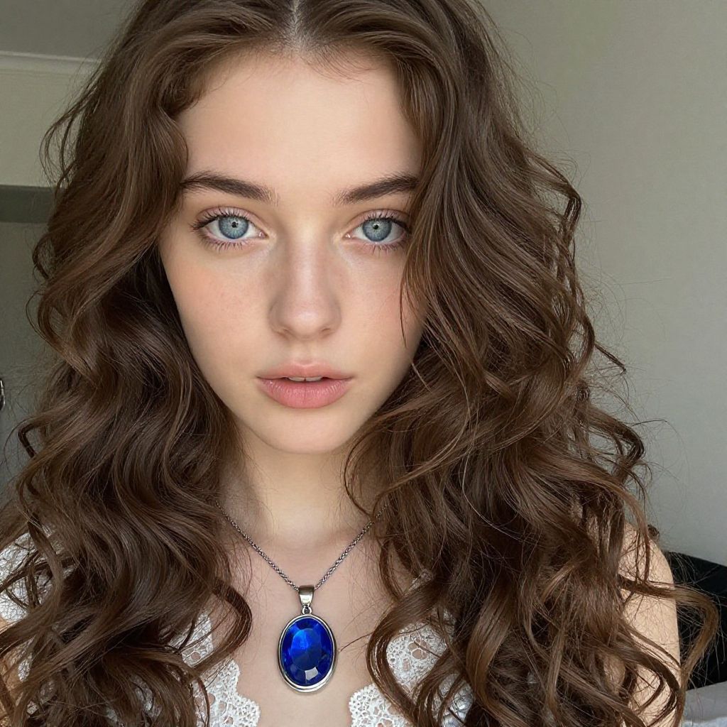 Photograph of a young woman with fair skin and curly, light brown hair tied in a loose ponytail with a white scrunchie. She has blue eyes, subtle makeup, and full lips slightly parted. She wears a silver necklace with a small, circular pendant and is topless, exposing her shoulders. The background is a plain, light gray. Her expression is neutral, and the lighting is soft, highlighting her natural beauty. The image has a slightly textured, almost vintage filter.