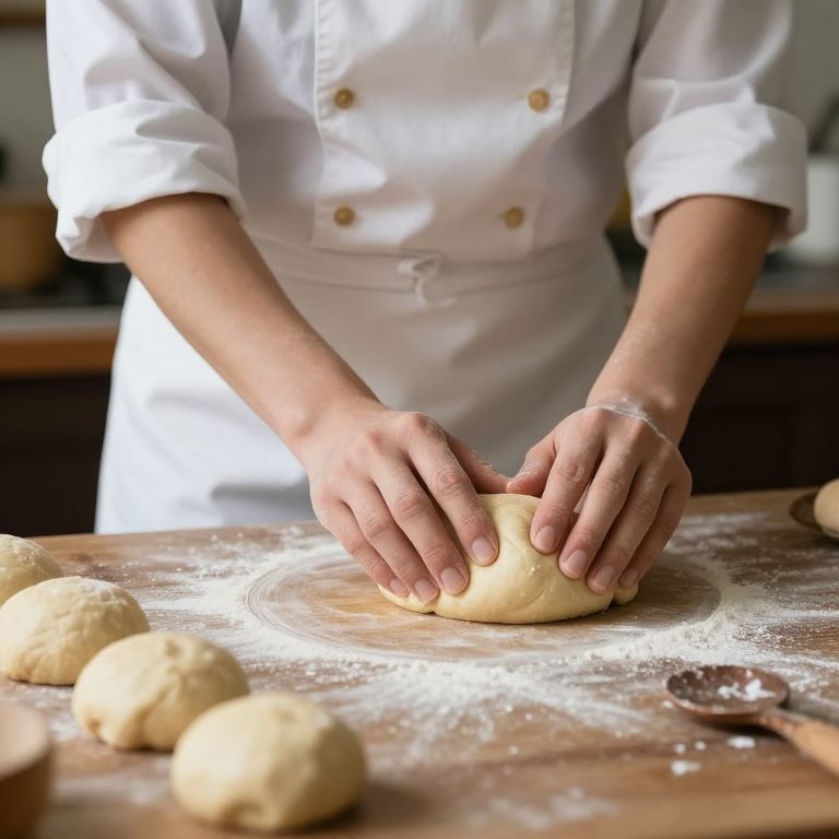 Photograph of a person's hands, wearing a white double-breasted chef's jacket, rolling a small, round, beige dough on a wooden countertop covered in flour. The person's wrists and forearms are visible, with a silver bracelet on the right wrist. Three more similar dough balls are scattered on the counter, and a few dried mushrooms are in the background. The lighting is natural, highlighting the texture of the dough and the smooth fabric of the chef's jacket. The background is slightly blurred, focusing attention on the dough-rolling action.