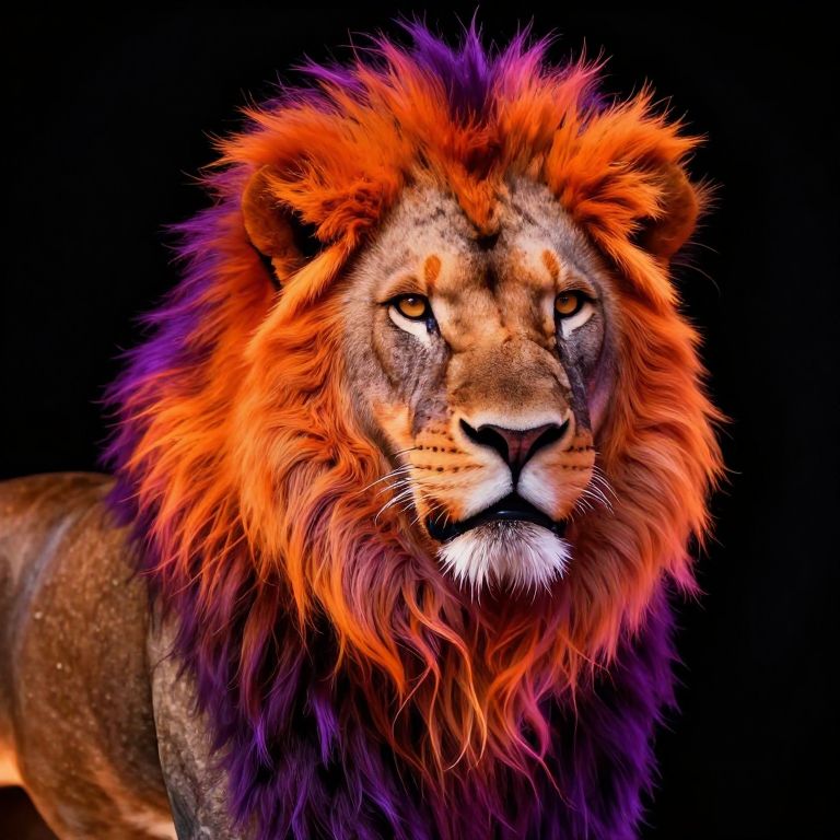 Photorealistic digital art of a majestic lion with vibrant orange, purple, and red mane, intense gaze, against a solid black background.