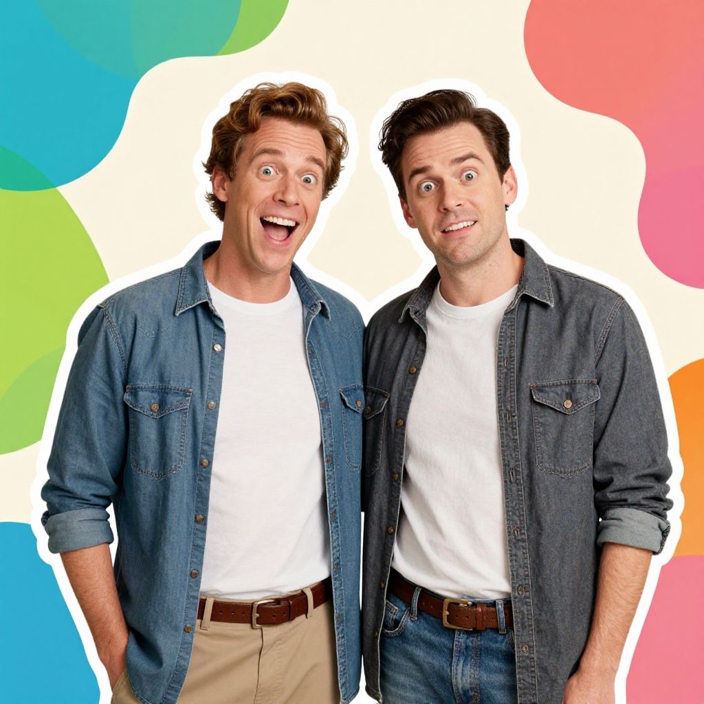 Step brothers portrait template with two men dressed in casual vintage clothes, humorous facial expressions, close framing, flat color background with abstract shapes, bold outlines, pop art style illustration.