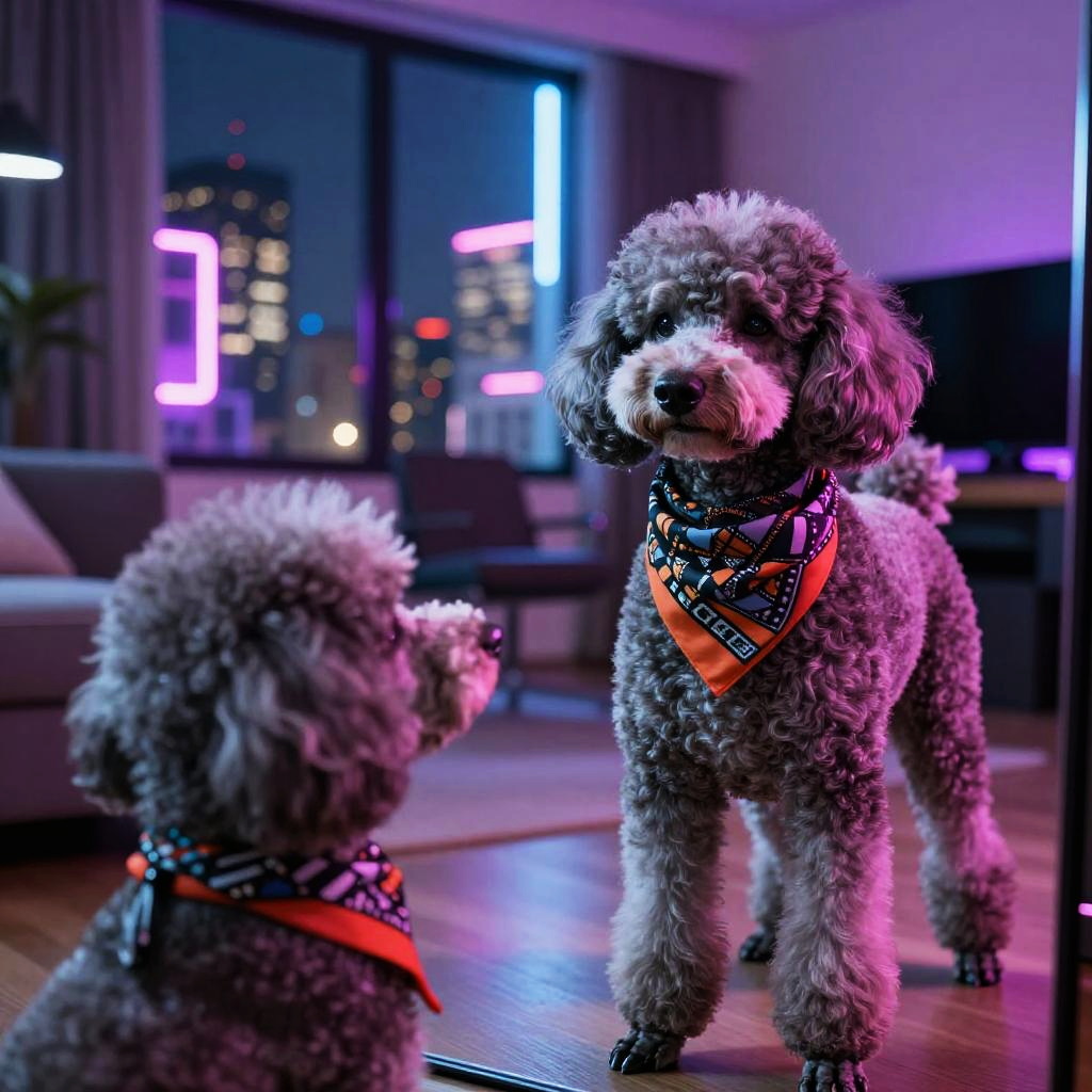 Dog taking mirror selfie, a stylish poodle with a scarf looking at its reflection, city apartment background with neon lights outside the window, futuristic cyberpunk vibe