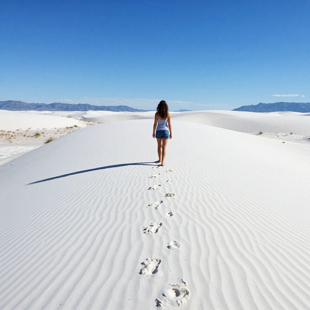 Photograph of a lone woman standing in a vast, sunlit desert with rippled white sand dunes under a clear, vivid blue sky. She is seen from behind, wearing a blue and white striped tank top and dark shorts, with long, wavy brown hair. Her shadow stretches to her left, and her footprints trail behind her on the sand. Distant, low-lying mountains are visible on the horizon. The bright sunlight enhances the stark contrast between the white sand and the blue sky, creating a sense of vast openness and solitude.