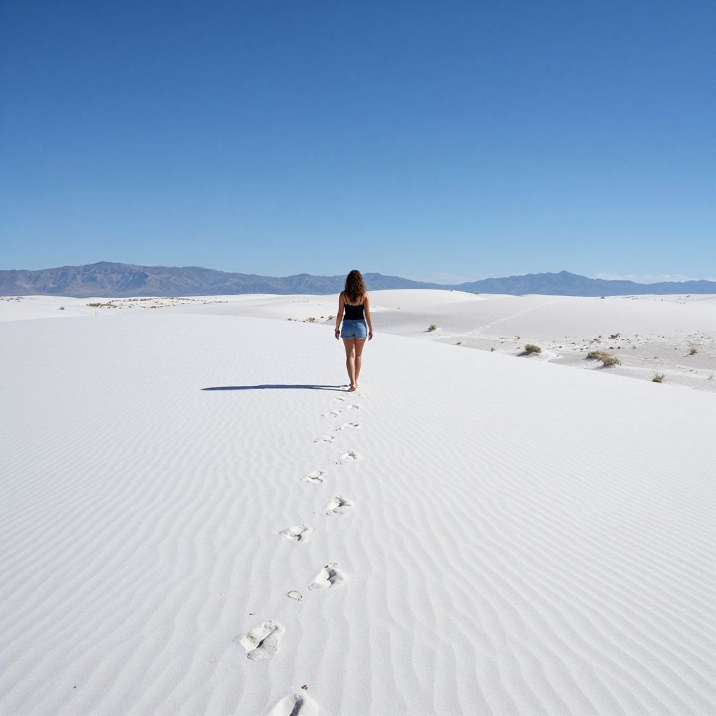 Photograph of a woman with dark hair, wearing a blue tank top and shorts, walking alone in a vast, white sand desert under a clear,