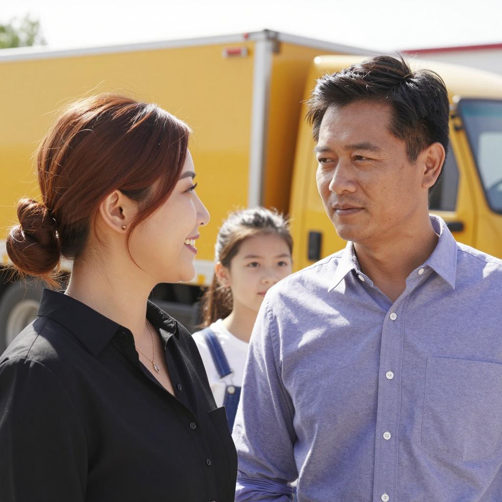 Photograph of two people. Woman with brown hair in red jacket leaning into car window, right hand near driver's shoulder. Man with glasses, brown jacket, and white shirt inside car, looking at woman. Background: blurred car and buildings.