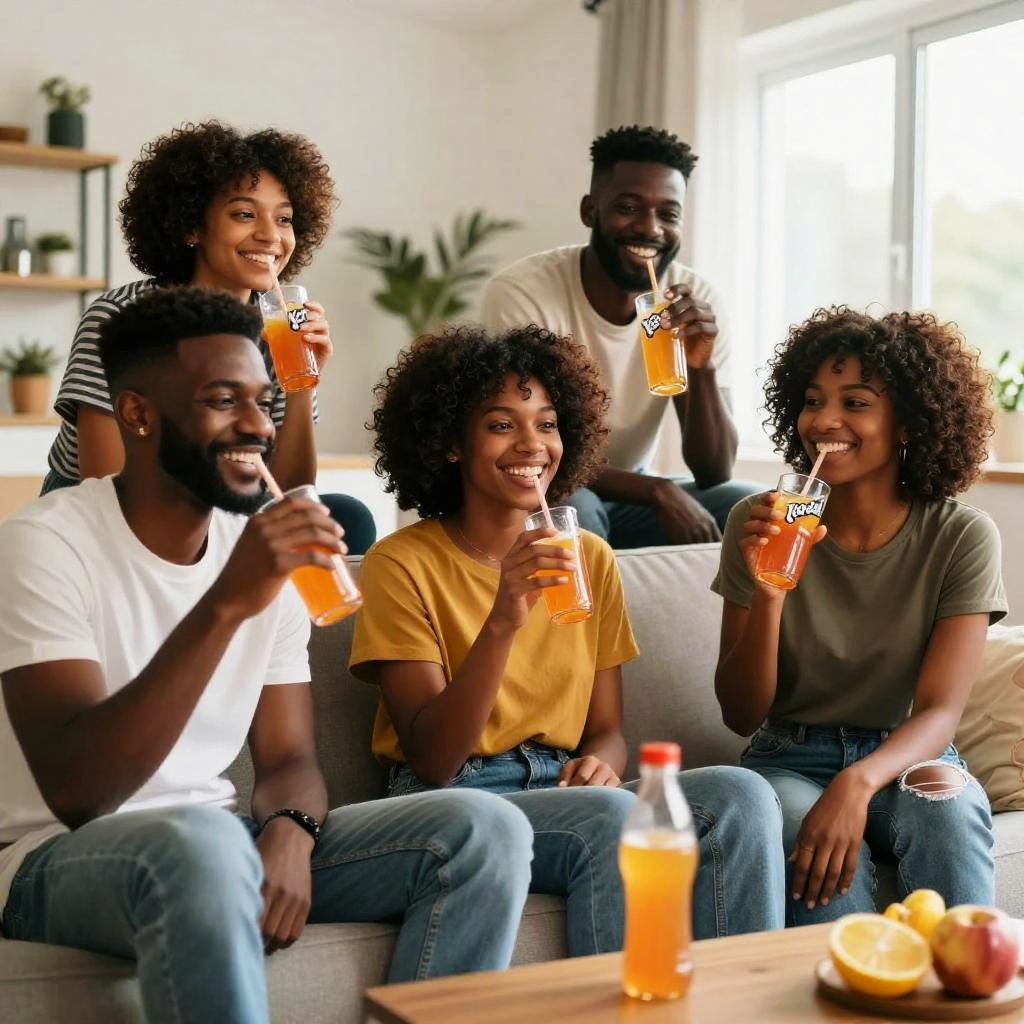 Photograph of six smiling Black friends with curly hair, casually dressed in t-shirts and jeans, sitting and standing in a bright, modern living room. They are holding orange drinks with straws, seated and standing around a beige couch. In the foreground, a wooden table with a bottle of orange juice and a half orange is visible. The background includes potted plants, a window with light curtains, and a shelf with small decor items, creating a warm and inviting atmosphere. Natural light fills the room, enhancing the relaxed, joyful vibe.