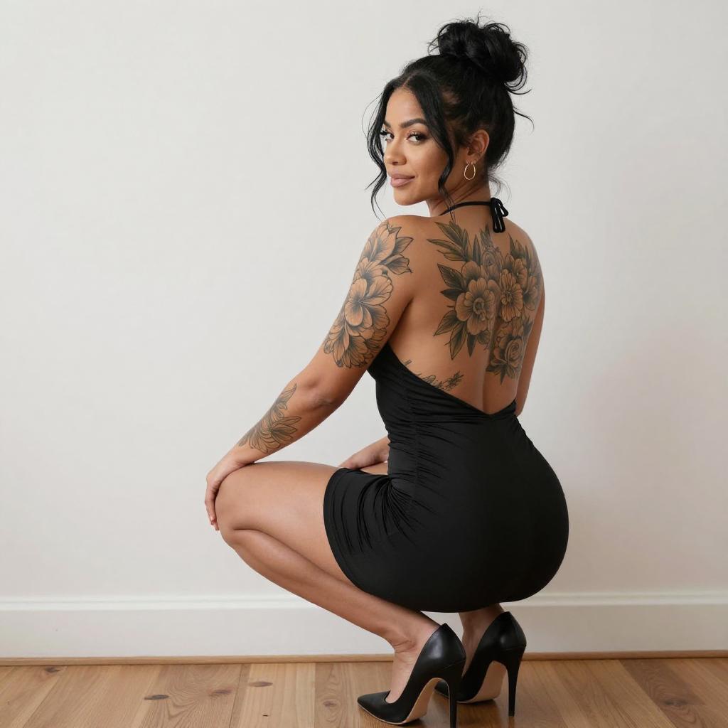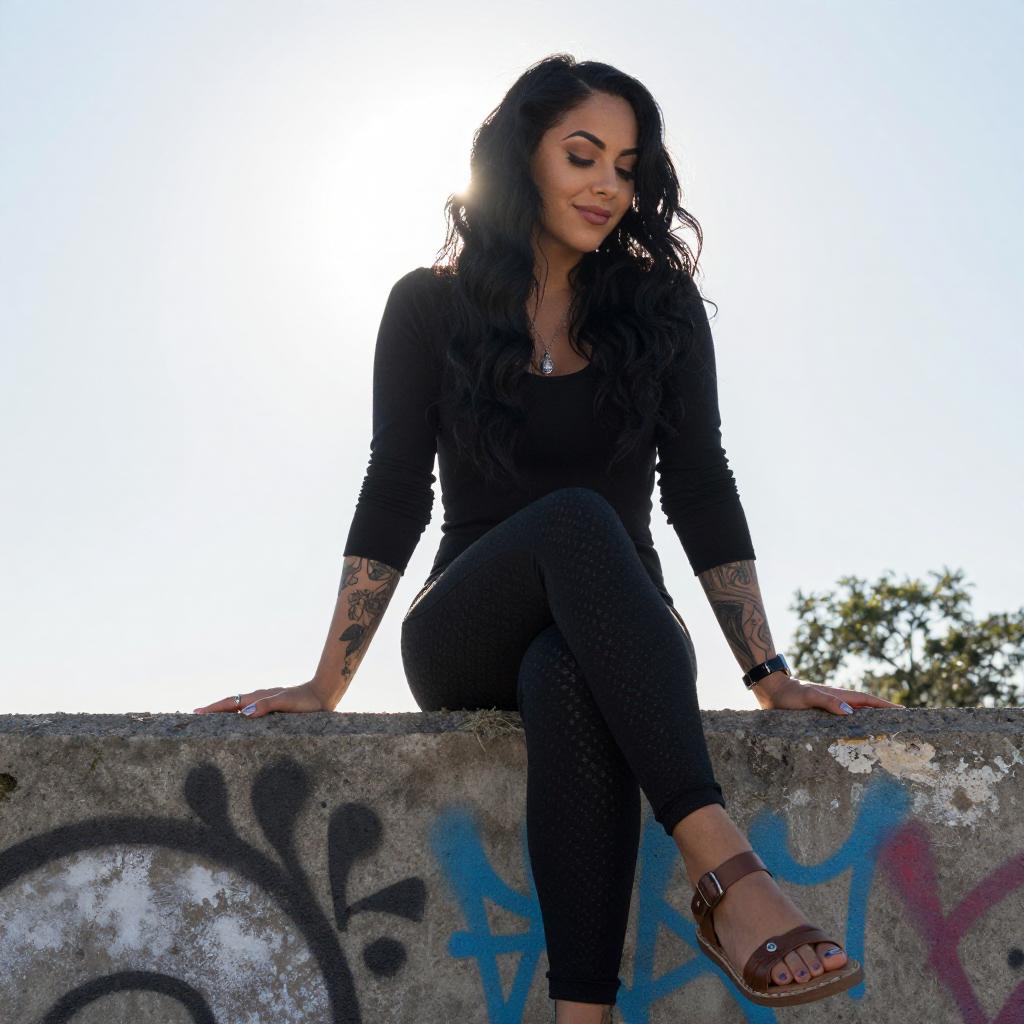 Photograph of a young woman with long, wavy black hair and tattoos, sitting on a graffiti-covered concrete ledge. She wears a black long-sleeve top, patterned black leggings, and brown sandals. Bright sunlight behind her creates a halo effect, highlighting her silhouette. She looks down with a slight smile, her hands resting on the ledge.