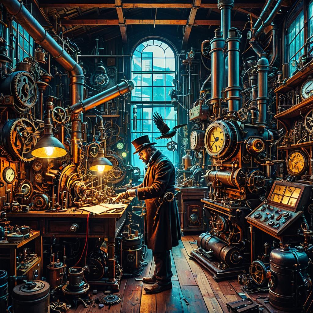 Digital painting of a steampunk inventor, inside a cluttered workshop filled with gears and steam boilers, building a miniature mechanical bird, rendered with vibrant neon highlights and intricate detailing for a futuristic yet vintage atmosphere.