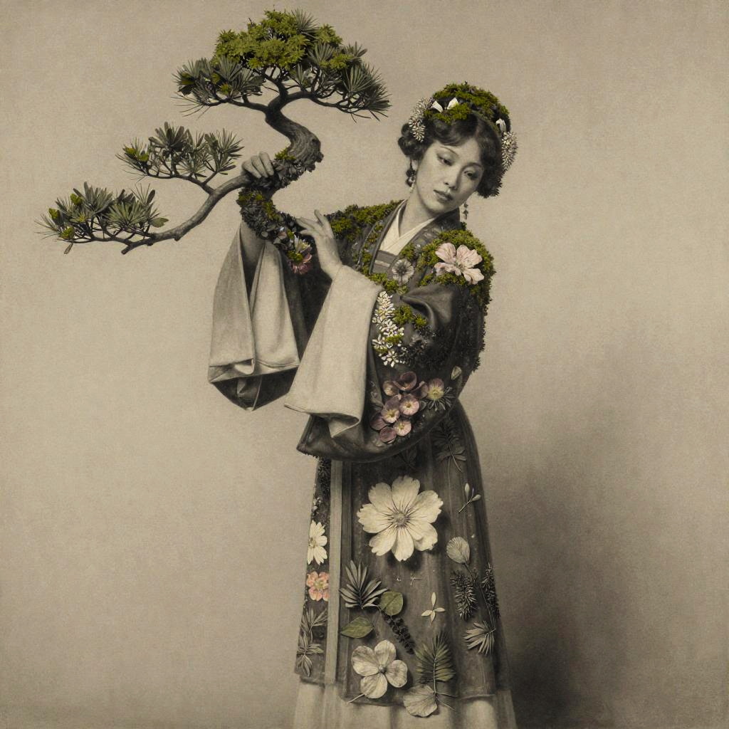 An opera singer woven from moss, bonsai branches and pressed petals intricately designed and fading, composed of various flowers and foliage. This artwork channels the styles of renowned artists, presented in a monochrome charcoal sketch from the early 20th century.