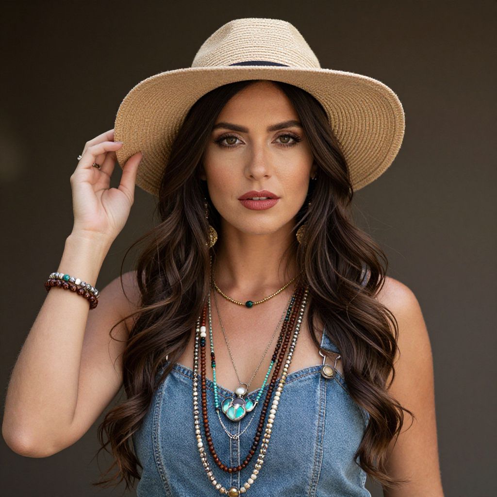 Photograph of a young woman with long, wavy dark brown hair, wearing a beige straw hat, blue denim sleeveless top, and multiple layered necklaces with turquoise and silver pendants. She has light skin, brown eyes, and wears dark red lipstick. Her right hand gently touches the brim of her hat. She also wears a black and silver bracelet on her right wrist. The background is a solid dark gray, emphasizing her stylish, bohemian appearance. The image has a sharp, vibrant quality with a focus on her face and upper body.