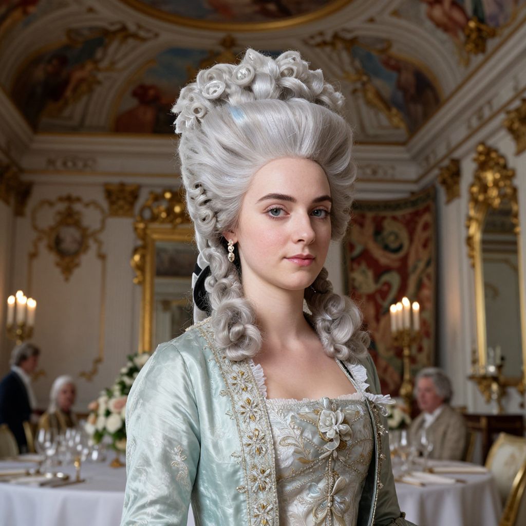 Photorealistic CGI of a young woman with pale skin, silver curled hair, and elaborate 18th-century dress in an ornate, gold-de