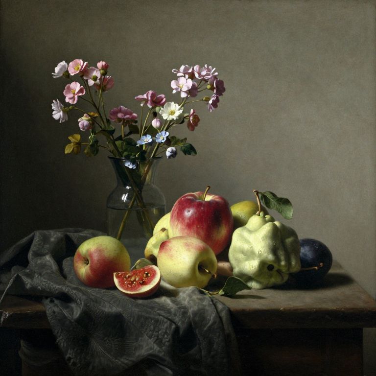 Vermeer still life of a sunlit table with ripe fruit, delicate flowers in a glass vase, soft shadows, and textured fabrics, evoking 17th century Dutch painting style.
