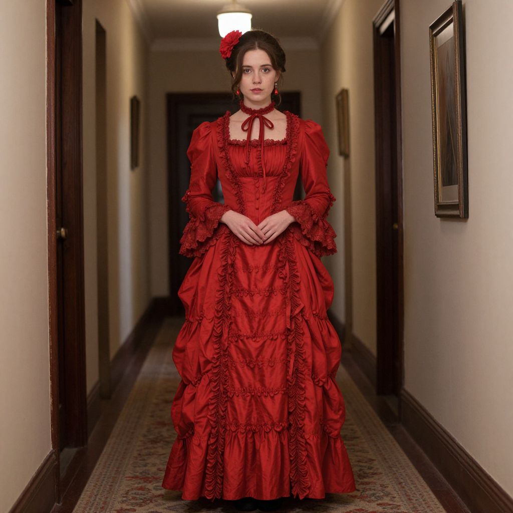 Photograph of a woman standing in a dimly lit, narrow hallway. She wears a voluminous, Victorian-style red dress with puffed sleeves, ruffled layers, and a high neckline tied with a ribbon. Her dark hair is adorned with a red flower. The hallway has cream-colored walls, dark wooden doors, and patterned carpet. Two framed pictures hang on the right wall. The woman's pale skin contrasts with the vivid red of her dress, and she gazes directly at the camera with a serious expression. The lighting emphasizes the richness of the dress and her solemn demeanor.