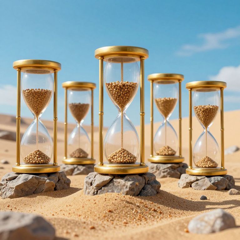 Sandy grains cascade through six towering hourglasses, their golden frames anchored atop rocky pedestals, as a surreal landscape beneath a vivid sky hints at the passage of time reversed, scattering sand pools below.