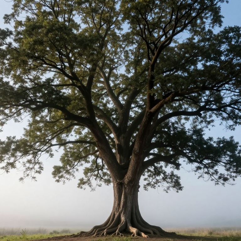 Colossal tree branches spread wide against a serene sky, its gnarled trunk rooted firmly as misty clouds drift below, creating a tranquil scene of ethereal beauty.