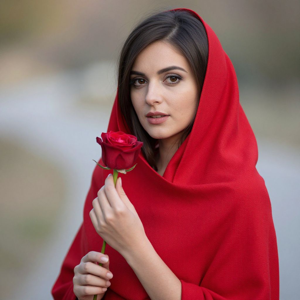 Photograph of a young woman with dark hair, wearing a vibrant red hooded cloak, holding a red rose, with a blurred outdoor background.