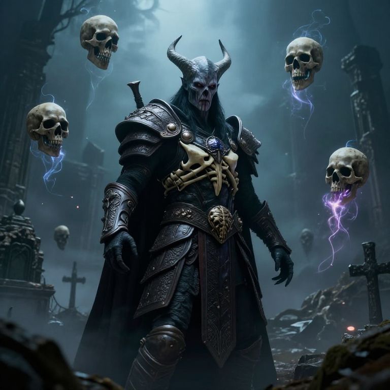 A githyanki necromancer surrounded by floating skulls and ethereal energy in a misty graveyard, ancient ruins in the background, wearing ceremonial armor mixed with bone motifs, grim expression, cinematic low lighting fantasy scene.