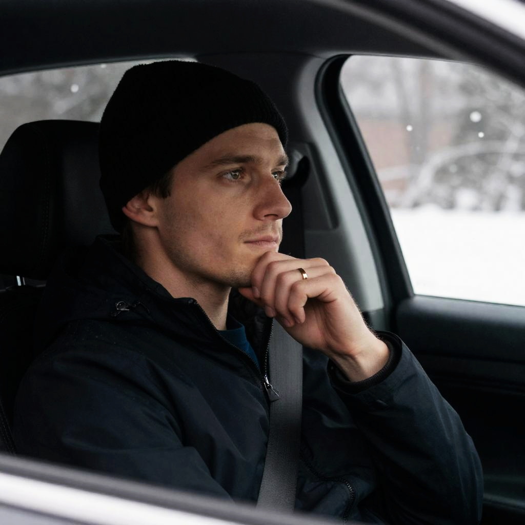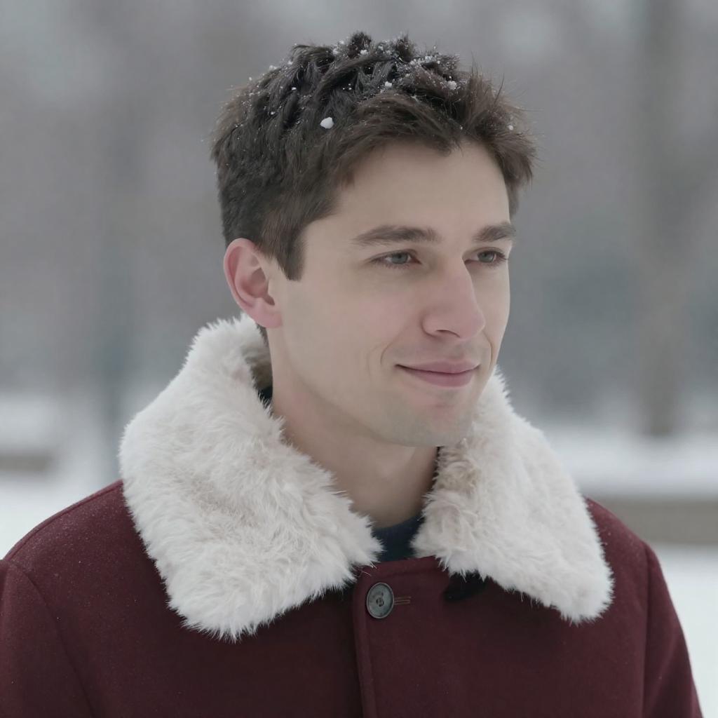 Man in black coat, gray scarf, and gloves, leaning on open car door, smiling, snowy landscape, tall evergreen trees, stone wall, red car, overcast sky. Snow on ground, car roof. Winter setting. One man. Casual stance.