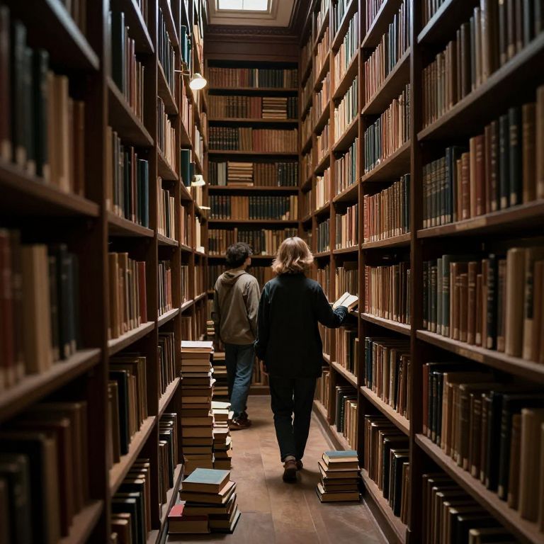In the hushed embrace of an ancient library, two figures navigate the labyrinth of knowledge, their solitary pursuit illuminated by the weighty silence of centuries, as scattered books whisper tales of transience and the eternal quest for understanding.