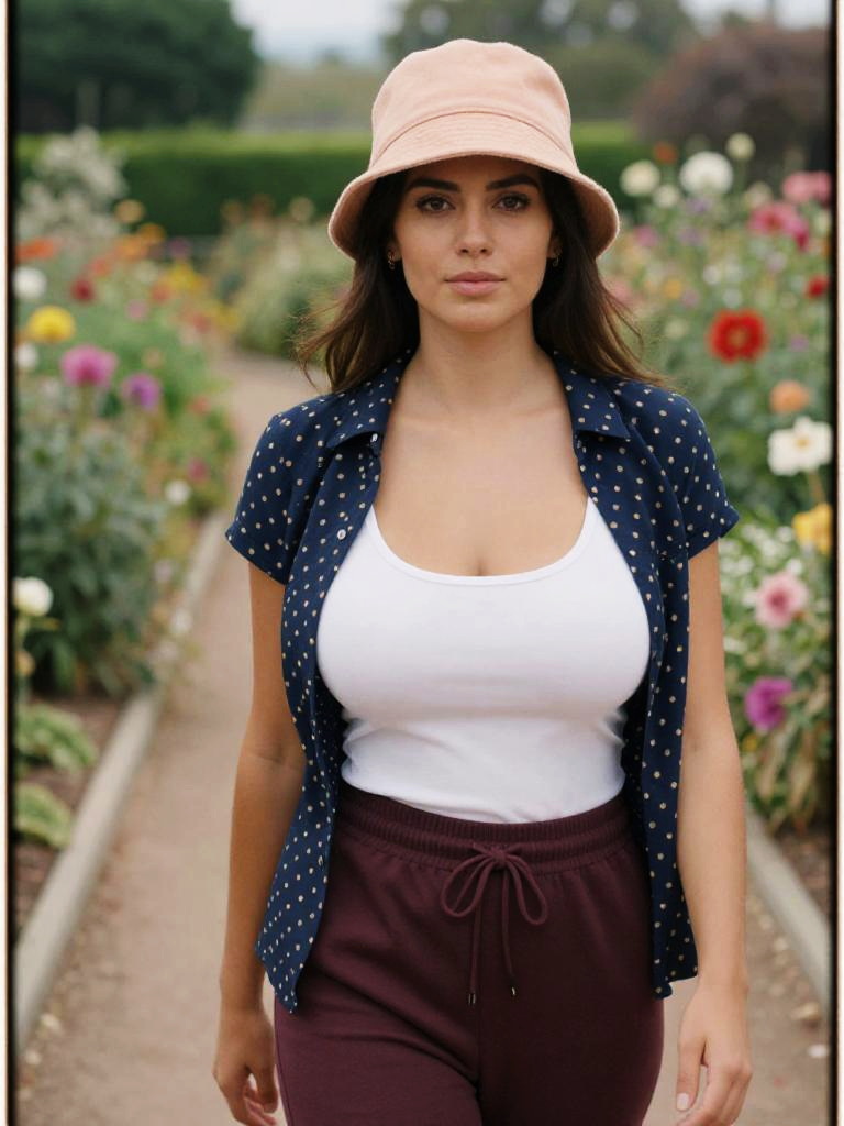 A Slim woman, in a casual sporty outfit featuring a navy short-sleeved button-up shirt with tan polka dots, a white tank top, and maroon joggers, wearing a soft peach bucket hat, captured in an Instant film style at a Flower garden along a winding trail. Sexy. Pretty face and beаutiful eyes. Big breasts