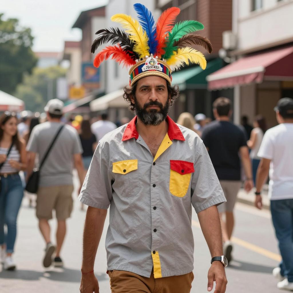 Edm rave man costume, photograph of a man with a colorful Native American-inspired headdress, black and pink feathers, silver circular ornament, yellow aviator sunglasses, black choker necklace, black t-shirt, pink and black leopard print jacket, black belt with gold buckle, street background, daylight, casual style, urban setting, slight blur in background, full body shot, confident expression, modern twist on traditional attire